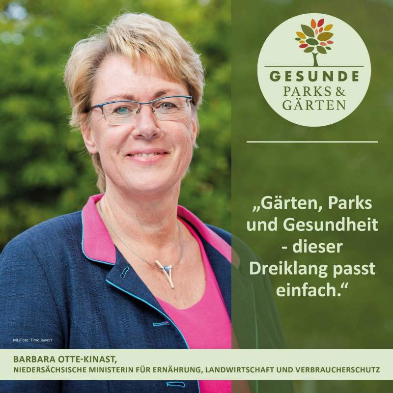 „Gärten, Parks und Gesundheit - dieser Dreiklang passt einfach.“, erklärt Ministerin Barbara Otte-Kinast, Niedersächsische Ministerin für Ernährung, Landwirtschaft und Verbraucherschutz. „Seit Jahrhunderten tragen Gärten und Parks dazu bei, dass wir Menschen gesund bleiben. Es gibt Nutzgärten wie Heilpflanzen- oder Kräutergärten, Klostergärten, dazu alte Bauerngärten, Kurparks und noch vieles mehr. In Niedersachsen haben wir all diese Park- und Gartentypen. Jetzt gilt es, unsere gartenkulturelle Vielfalt bekannter zu machen! Dazu wird die Studie "Gesunde Parks und Gärten" einen wertvollen Beitrag leisten.“