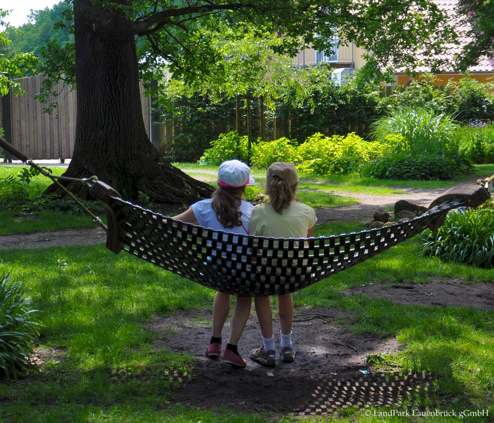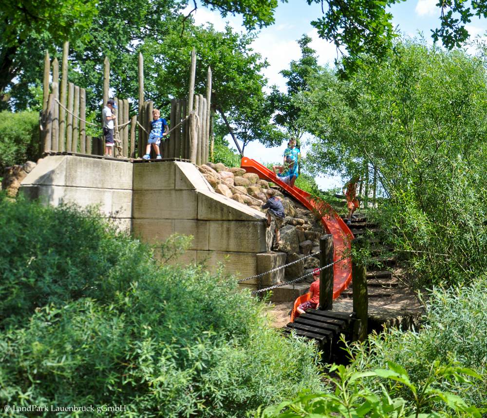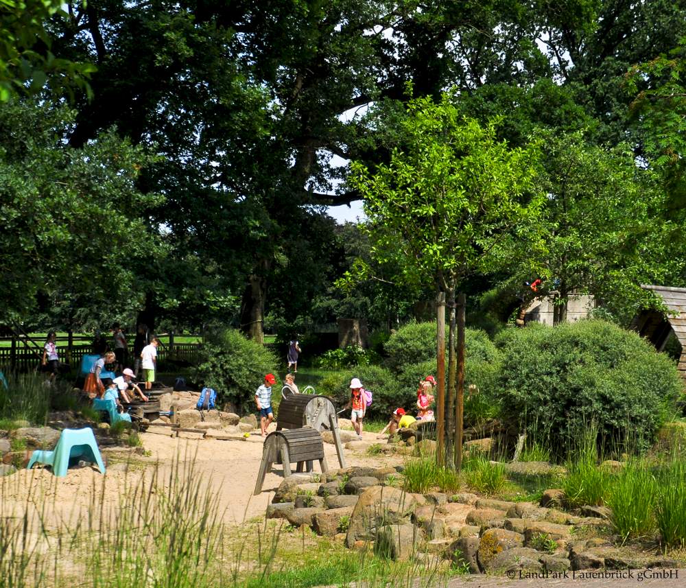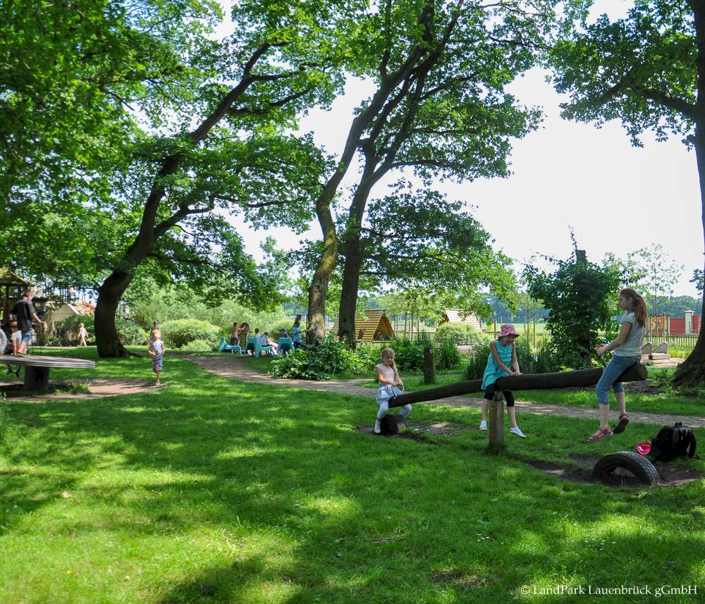 Unsere größte Spiellandschaft am Kaffeegarten ist eine natürliche bewachsene Fläche unter wunderschönen mehreren hundert Jahre alten Eichen gelegen. Das Zentrum der Spiellandschaft symbolisiert eine zerfallene Burg, deren Burghügel zum Erklettern und Erkunden einlädt. Von oben zeigt sich, dass die Burgruine an einem ausgetrockneten Fluss zu liegen scheint, der heute eine riesige Sandspielkiste ist. Die Uferzone bilden große Steine, die als Sitzgelegenheiten dienen. Neben der Burg, einer Hängebrücke und einem Krabbeltunnel bietet der Mehrgenerationenspielplatz aber noch ein weiteres Highlight: Mit einer großen Wasserpumpe und verschiedenen Führrinnen können die Kinder ihr eigenes Kanalsystem schaffen, ob links oder rechts entlang oder ein Staudamm zum Wasserauffangen, hier sind der Phantasie keine Grenzen gesetzt. Nicht ohne Grund kann man hier häufig Väter mit ihren Kindern beim Werkeln beobachten. Nach getaner Arbeit laden dann unsere bequemen Hängematten noch zu einem wohlverdienten Mittagsschläfchen ein.