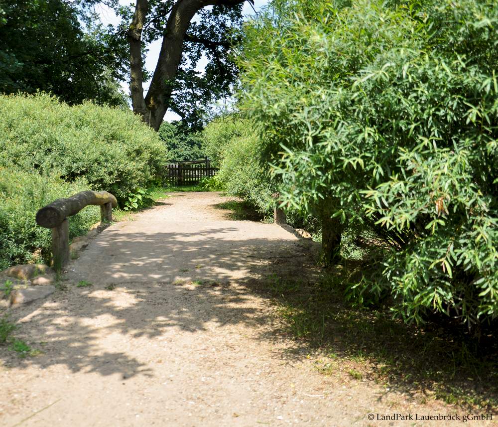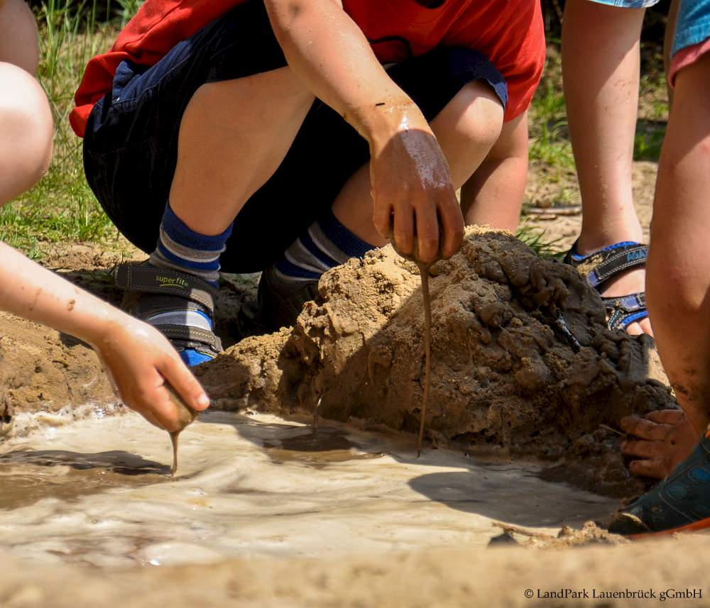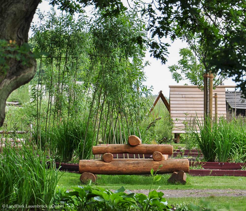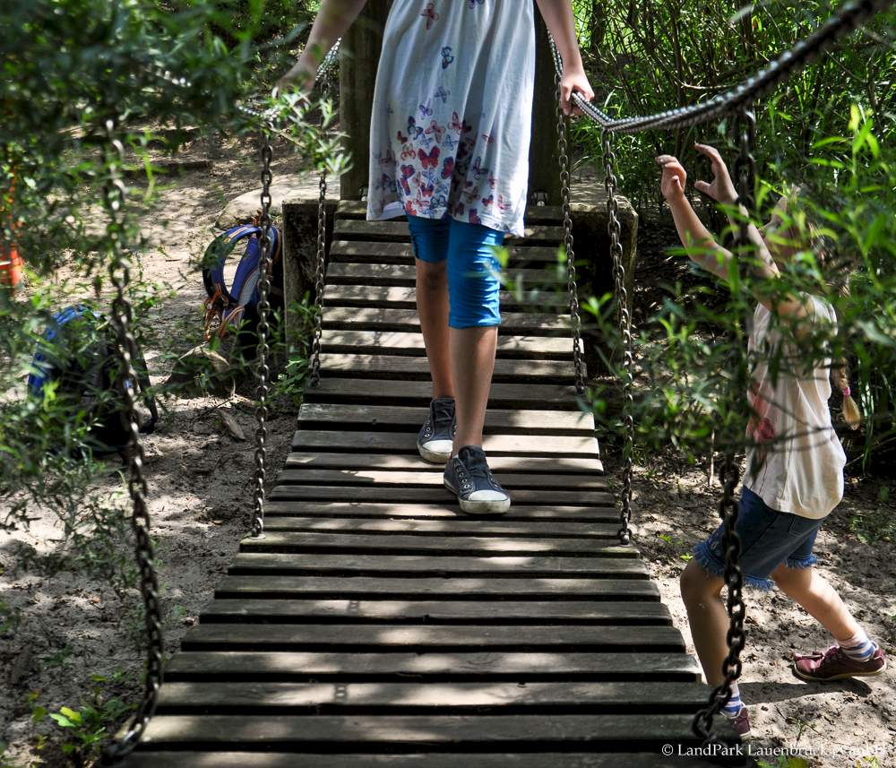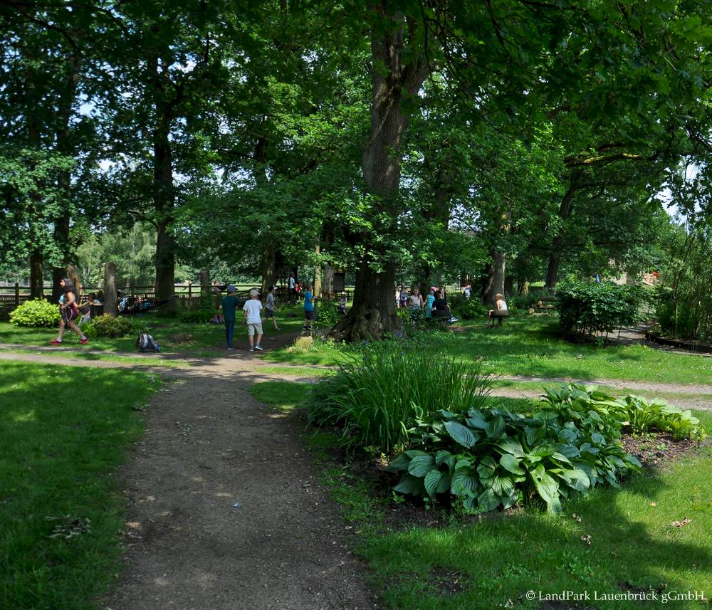 Unsere größte Spiellandschaft am Kaffeegarten ist eine natürliche bewachsene Fläche unter wunderschönen mehreren hundert Jahre alten Eichen gelegen. Das Zentrum der Spiellandschaft symbolisiert eine zerfallene Burg, deren Burghügel zum Erklettern und Erkunden einlädt. Von oben zeigt sich, dass die Burgruine an einem ausgetrockneten Fluss zu liegen scheint, der heute eine riesige Sandspielkiste ist. Die Uferzone bilden große Steine, die als Sitzgelegenheiten dienen. Neben der Burg, einer Hängebrücke und einem Krabbeltunnel bietet der Mehrgenerationenspielplatz aber noch ein weiteres Highlight: Mit einer großen Wasserpumpe und verschiedenen Führrinnen können die Kinder ihr eigenes Kanalsystem schaffen, ob links oder rechts entlang oder ein Staudamm zum Wasserauffangen, hier sind der Phantasie keine Grenzen gesetzt. Nicht ohne Grund kann man hier häufig Väter mit ihren Kindern beim Werkeln beobachten. Nach getaner Arbeit laden dann unsere bequemen Hängematten noch zu einem wohlverdienten Mittagsschläfchen ein.