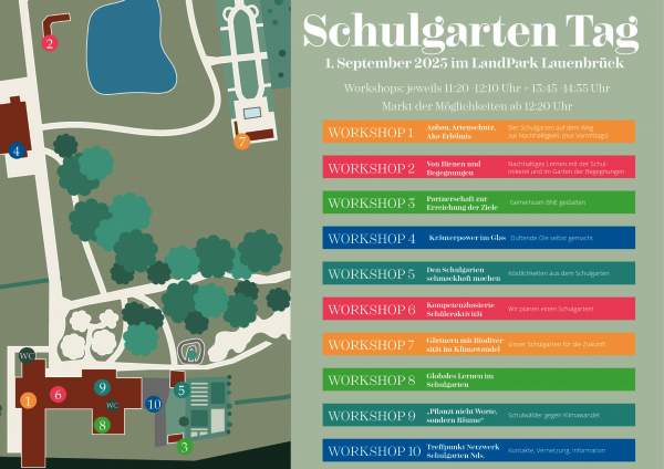 Freuen Sie sich auf inspirierende Workshops, praktische Pflanzaktionen, spannende Vorträge und den Austausch mit Expertinnen und Experten aus Umweltpädagogik, Gartenbau und Schule. Zwischen blühenden Beeten und duftenden Kräutern gibt es jede Menge Ideen, wie Nachhaltigkeit, Biodiversität und Lernen Hand in Hand gehen können.